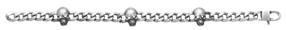 Una catena classica che diventa gioiello contemporaneo, arricchita da tre piccoli teschi realizzati in fusione a cera persa. Da notare la chiusura a moschettone dal design in continuità stilistica con la catena. Materia che si fa stile, per una eleganza maschile senza tempo.
