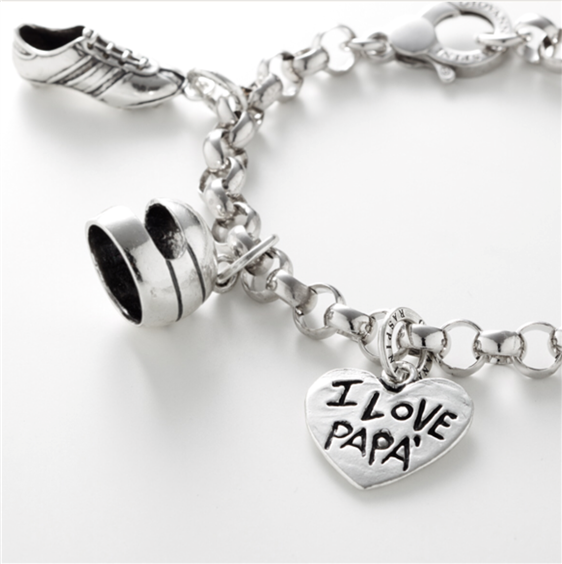 Charm "I love papà". L'amore di un figlio verso il proprio padre in un charm delicato, ma potente e sincero. Altezza cm.2,50 (esclusa maglina di cm.0,90).