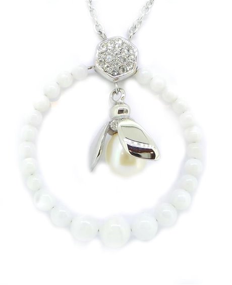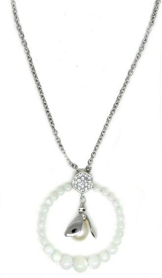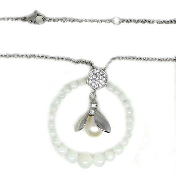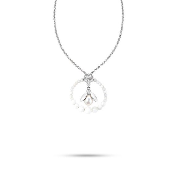 MORELLATO ANIMALIA collana girocollo in acciaio maglia rolo' con ciondolo composto da cerchio in madreperla contenente un'ape. LUNGHEZZA : CM 45 accorciabile a cm 42 grazie ad anello posto sulla maglia DIMENSIONI: CIONDOLO diametro cm 3 PIETRE: perla a goccia mm 7/7,5 cristalli bianchi/cerchio in madreperla.