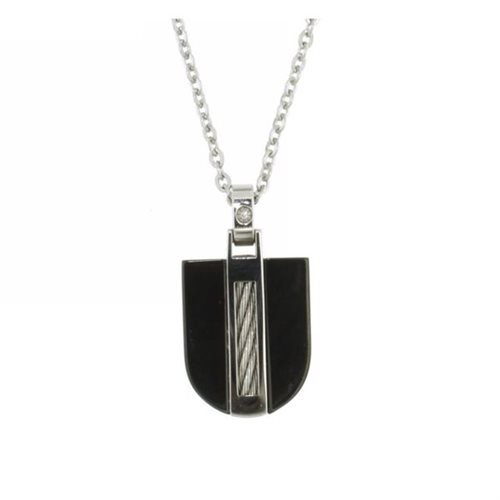 Collana uomo in acciaio 316L , girocollo maglia rollò , lunghezza cm 50 , pendente cm 3 , pendente con pietra dura nera e diamante naturale selezionato. Immagine indicativa , la confezione può variare in forma e colore.