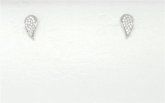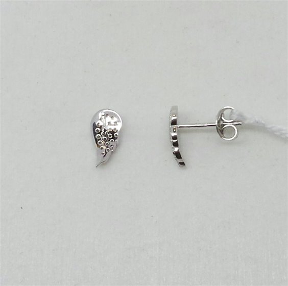 Orecchini a forma di ala in argento 925/° con zirconi incastonati, fissi a lobo con farfallina di chiusura. Ala base 0.5 cm. Altezza 1 cm.