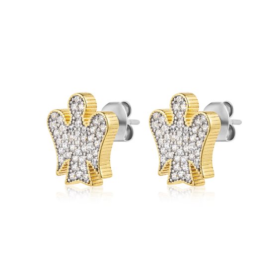 Orecchini Angeli in argento bianco e giallo e zirconi bianchi. Questi orecchini racchiudono un forte simbolismo legato agli Angeli, che rappresentano da sempre amore e protezione. Perfetti da regalare a donne di ogni età e che amano essere eleganti con un tocco di originalità. Con la celestiale sagoma degli Angeli in argento bianco, bordo in argento giallo deliziosamente rifinito e zirconi bianchi, si fanno notare per l'originale abbinamento di colori e materiali che salta subito all'occhio. Originali e moderni grazie alla lavorazione dell'argento e per le forme delicate degli Angeli mantengono quella classicità ed eleganza che li rende perfetti per tutte le donne che vogliono risplendere. Angelo: base 1 cm - altezza 1,2 cm