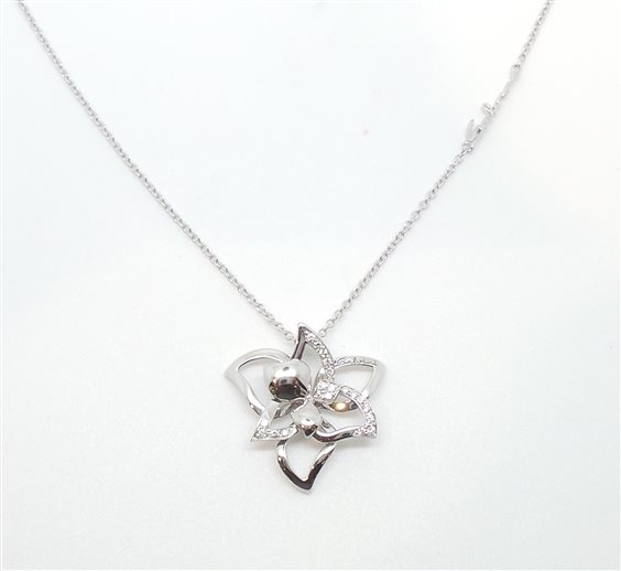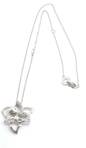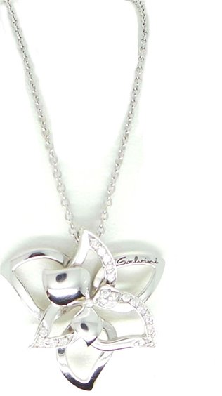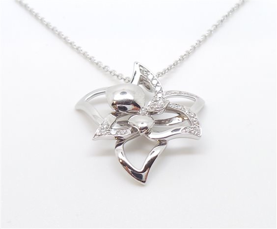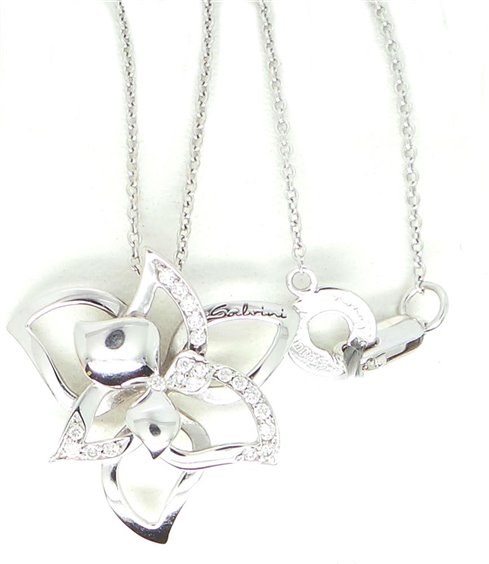 prodotto di casa DAMIANI , linea SALVINI collezione "i Fiori di Salvini" in oro bianco 18 carati. Collier donna a forma di fresia con diamanti kt 0.16 colore H. PESO totale GR 5,7 MISURA 21,5 X 21,5 MM. La catenina rolo' riporta logo SALVINI misura 45 cm con annellino predisposto per regolazione più corta. Chiusura a pappagallo. Accompagnato da certificato gemmologico e contro scippo e rapina.