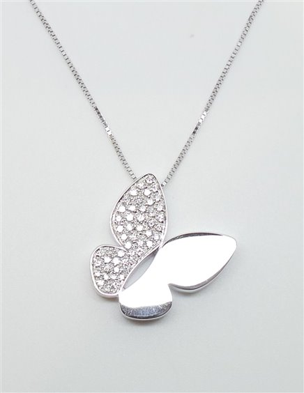 Collier in oro bianco 18kt con pendente farfalla, pavè di diamanti taglio brillante di ct.0,51 complessivi. Dimensioni pendente cm2,7X2,7. Scatola e garanzia originalità del prodotto. Un must della Maison Salvini, un' icona di stile dell' alta gioielleria Made in Italy: questo è la collezione di gioielli Farfalle Textures