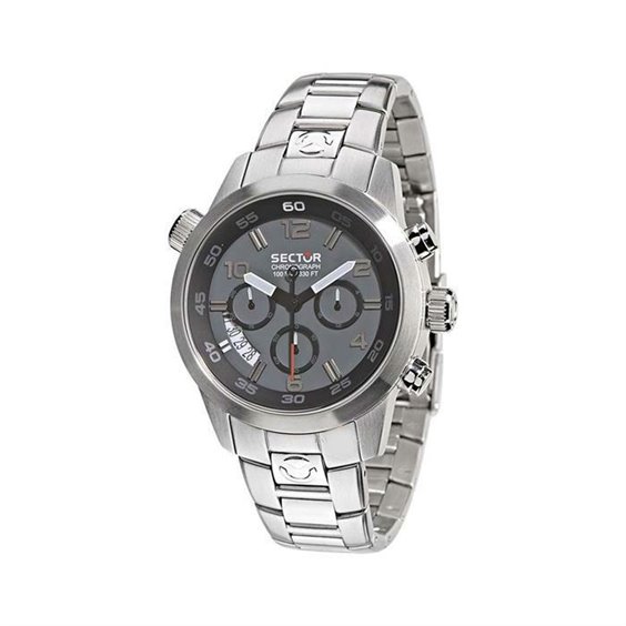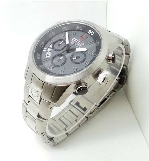 Orologio Sector con movimento al quarzo con cronografo e datario, cassa mm 42, sfondo grigio con ghiera regolabile da corona esterna, lancette luminose al buio, corona in acciaio a pressione. Cinturiono in acciaio con chiusura di sicurezza, fondello in acciaio a vite WR 100 metri. Scatola e garanzia 2 anni