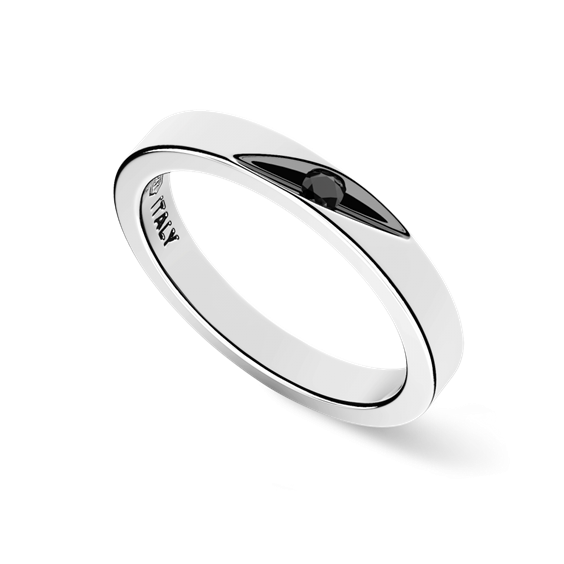 Anello in argento e spinello nero incastonato in una particolare apertura dal taglio arrotondato. Anello dal peso di 4,80 gr in argento 925. Trattamento al rutenio nero. Una rivisitazione moderna di un classico. L'anello fa parte della collezione Insignia 925, ispirata ad un design minimal e pulito, perfetta per tutte le occasioni. L'anello è completamente realizzato a mano in Italia.